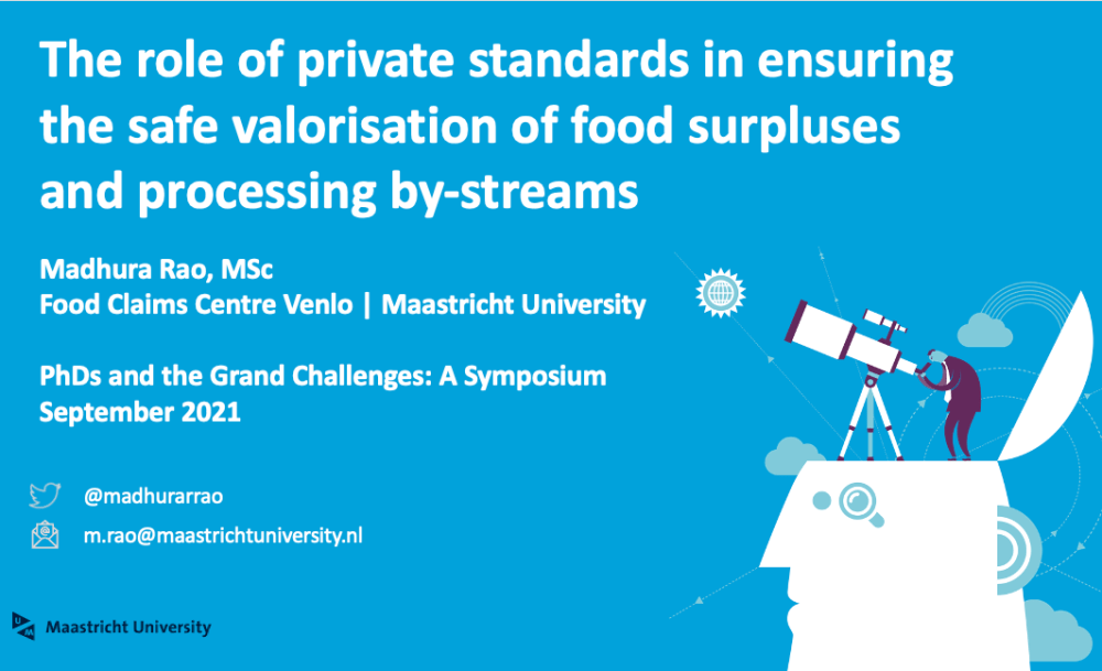 In September 2021, I presented my work on food waste valorisation at the PhDs and the Grand Challenges symposium organised by the University of Bath’s Centre for Business, Organisations and Society. The symposium invited doctoral researchers from a variety of management and allied fields to share their ideas on tackling the host of grand challenges the world faces today. The event focussed on topics such as climate change, sustainable consumption, circular economy, and resource scarcity and waste reduction. I shared a proposal for a future study where I hope to investigate whether private food safety standards could play a role in assisting food businesses in safely and sustainably valorising their food processing byproducts.